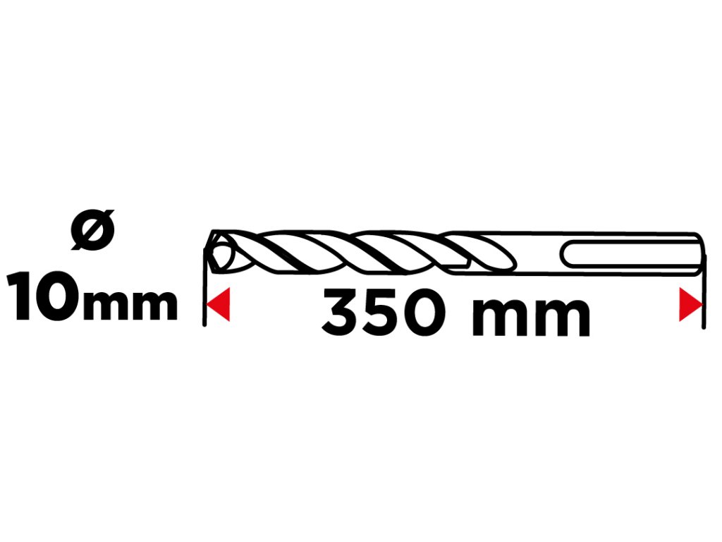 Vrták do železobetónu, stopka SDS Plus, priemer 10 mm, celková dĺžka 350 mm, vidlica QUATRO (štyri vidlice s krížovým nastavením), dvojitá špirála, pracovná dĺžka vrtáka 280 mm.