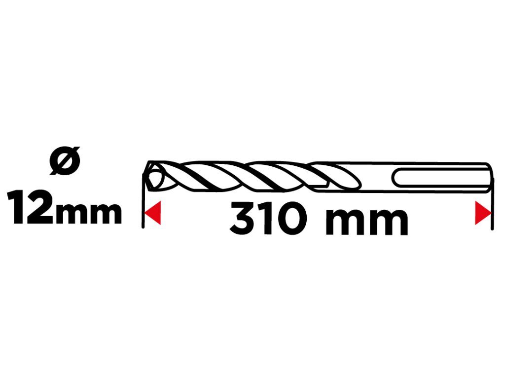 Vrták do železobetónu, stopka SDS Plus, priemer 12 mm, celková dĺžka 310 mm, vidlica QUATRO (štyri krížové vidlice), dvojitá špirála, pracovná dĺžka vrtáka 240 mm.