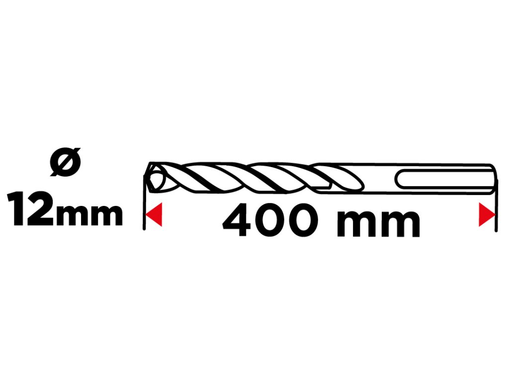 Vrták do železobetónu, stopka SDS Plus, priemer 12 mm, celková dĺžka 400 mm, vidlica QUATRO (štyri vidlice s krížovým nastavením), dvojitá špirála, pracovná dĺžka vrtáka 330 mm.