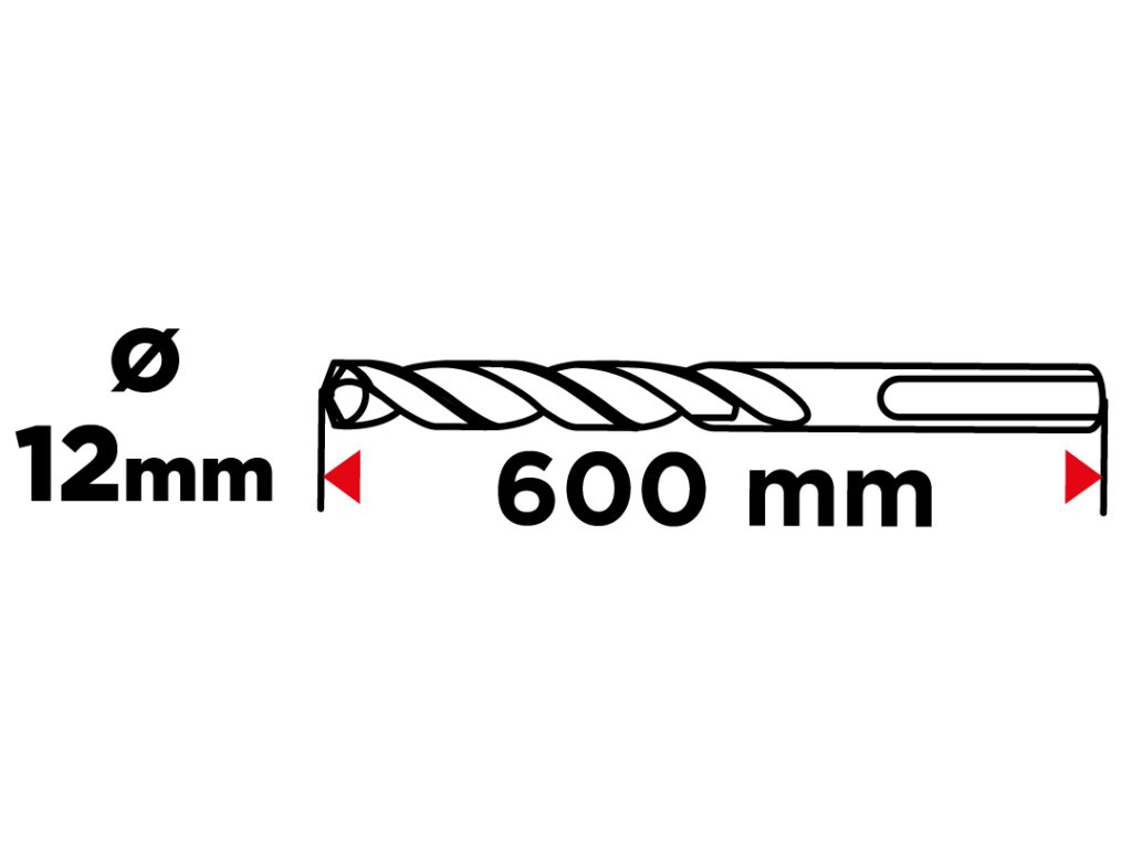 Vrták do železobetónu, stopka SDS Plus, priemer 12 mm, celková dĺžka 600 mm, vidlica QUATRO (štyri vidlice s krížovým nastavením), dvojitá špirála, pracovná dĺžka vrtáka 530 mm.