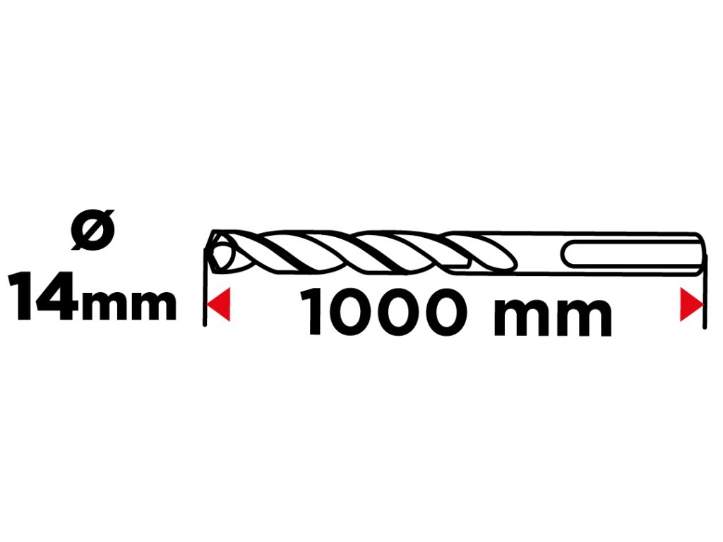 Vrták do železobetónu, stopka SDS Plus, priemer 14 mm, celková dĺžka 10000 mm, vidlica QUATRO (štyri vidlice s krížovým nastavením), dvojitá špirála, pracovná dĺžka vrtáka 930 mm.