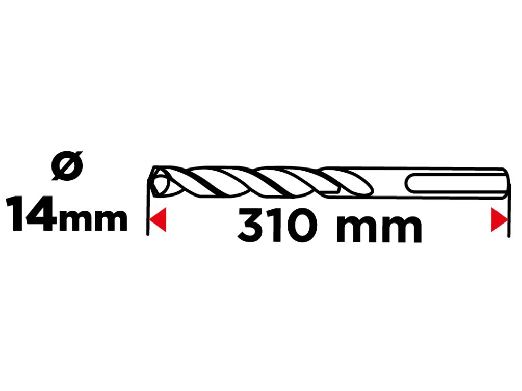 Vrták do železobetónu, stopka SDS Plus, priemer 14 mm, celková dĺžka 310 mm, vidlica QUATRO (štyri krížové vidlice), dvojitá špirála, pracovná dĺžka vrtáka 240 mm.