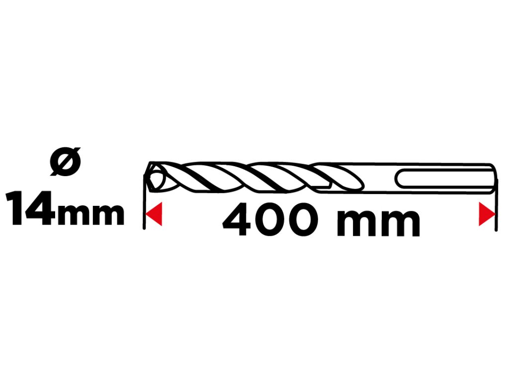 Vrták do železobetónu, stopka SDS Plus, priemer 14 mm, celková dĺžka 400 mm, vidlica QUATRO (štyri vidlice s krížovým nastavením), dvojitá špirála, pracovná dĺžka vrtáka 330 mm.