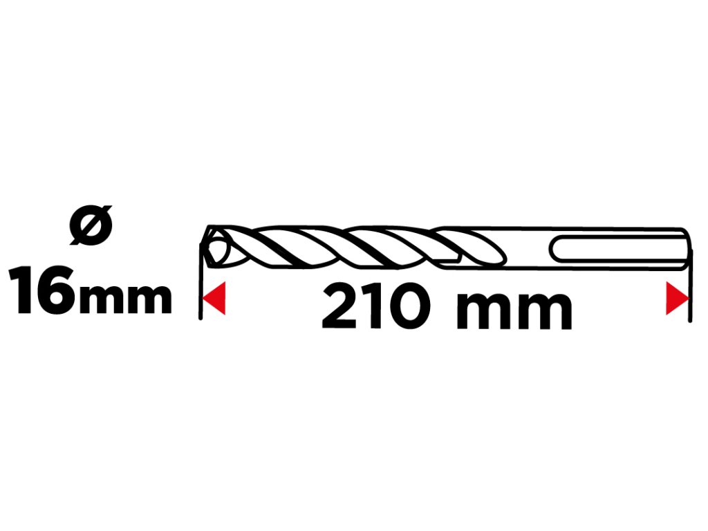 Vrták do železobetónu, stopka SDS Plus, priemer 16 mm, celková dĺžka 210 mm, vidlica QUATRO (štyri krížové vidlice), dvojitá špirála, pracovná dĺžka vrtáka 140 mm.