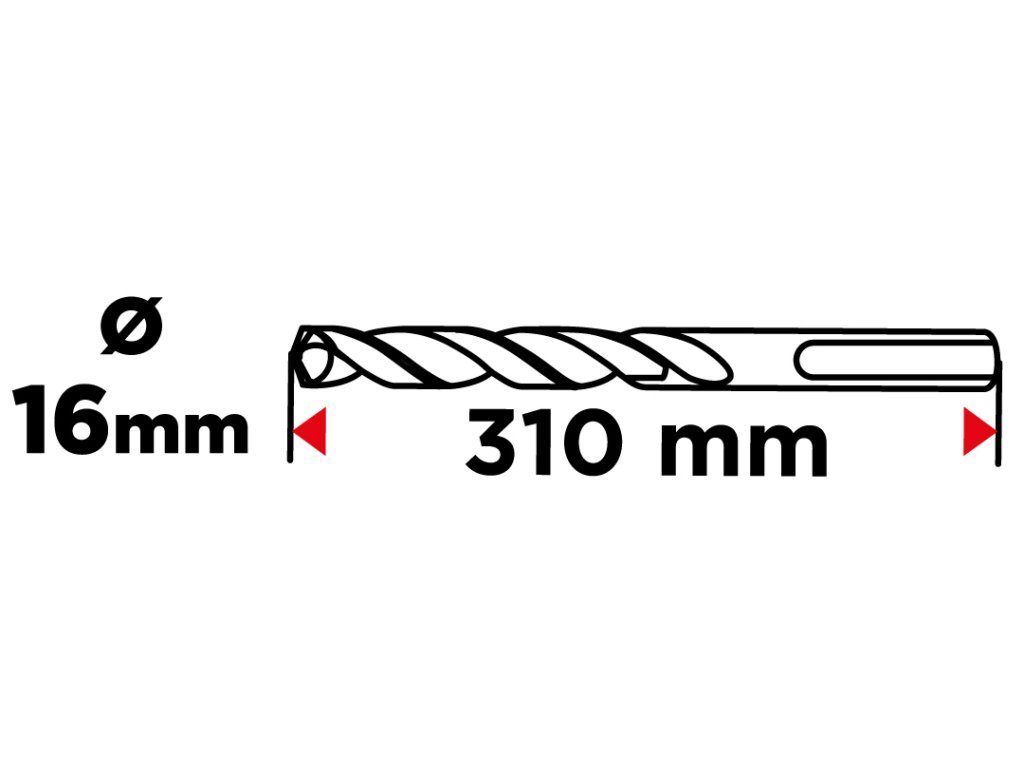Vrták do železobetónu, stopka SDS Plus, priemer 16 mm, celková dĺžka 310 mm, vidlica QUATRO (štyri krížové vidlice), dvojitá špirála, pracovná dĺžka vrtáka 240 mm.
