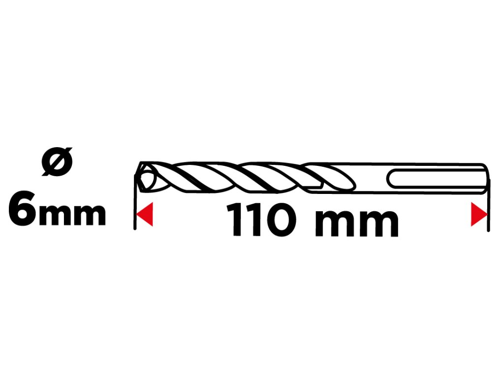 Vrták do železobetónu, stopka SDS Plus, priemer 6 mm, celková dĺžka 110 mm, vidlica QUATRO (štyri krížové vidlice), dvojitá špirála, pracovná dĺžka vrtáka 40 mm.
