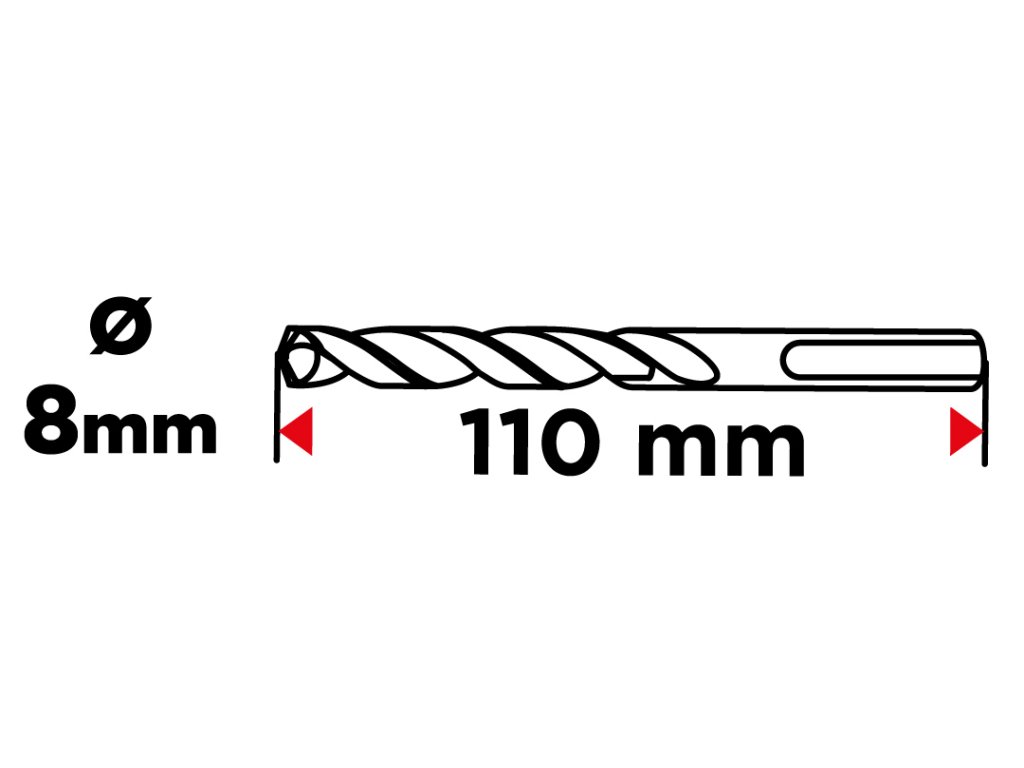 Vrták do železobetónu, stopka SDS Plus, priemer 8 mm, celková dĺžka 110 mm, vidlica QUATRO (štyri krížové vidlice), dvojitá špirála, pracovná dĺžka vrtáka 40 mm.