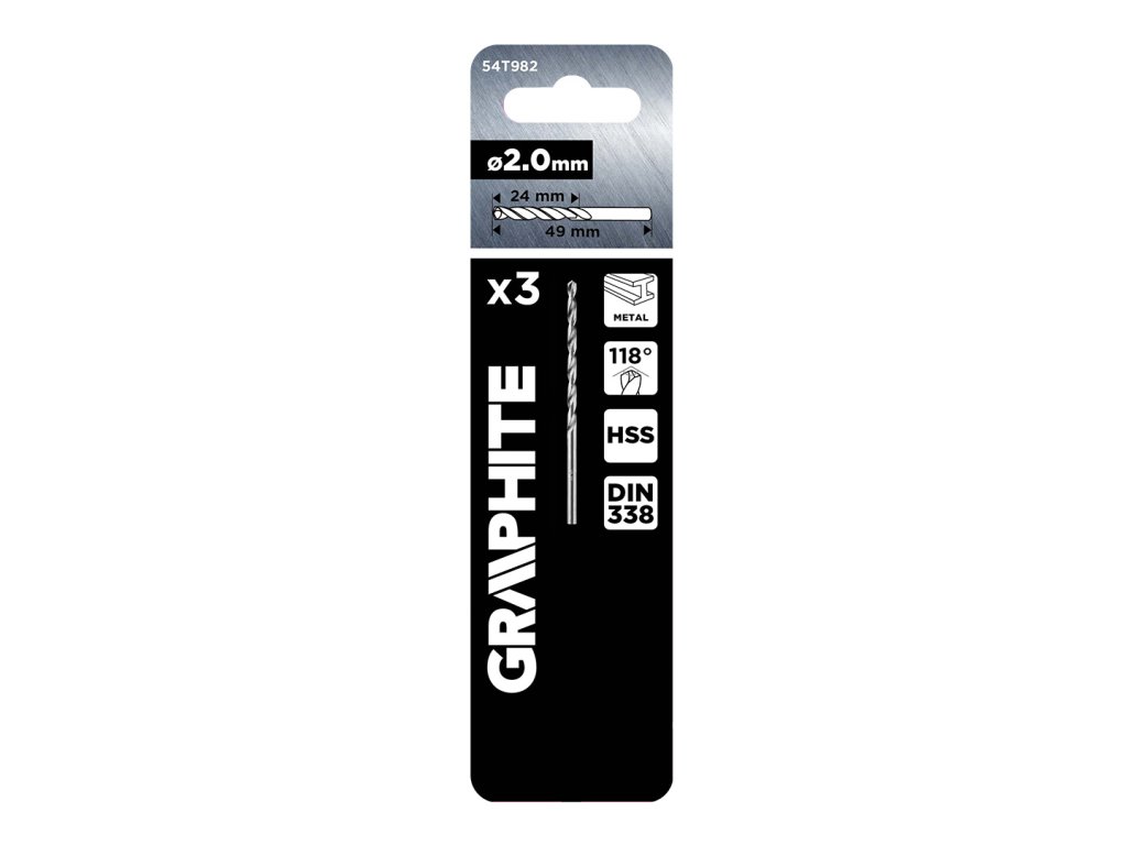 Vrtáky do kovu HSS, 2,0 mm, 3 ks. 54T982 od GRAPHITE je sada 3 vrtákov určených na prácu s kovom. Jednotlivé kusy sa vyznačujú priemerom 2 mm, celkovou dĺžkou 49 mm a pracovnou dĺžkou 24 mm. Uhol hrotu vrtákov GRAPHITE je 118 stupňov. Nástroje sú v súlade s normou DIN 338 a budú užitočné pri amatérskych aplikáciách.