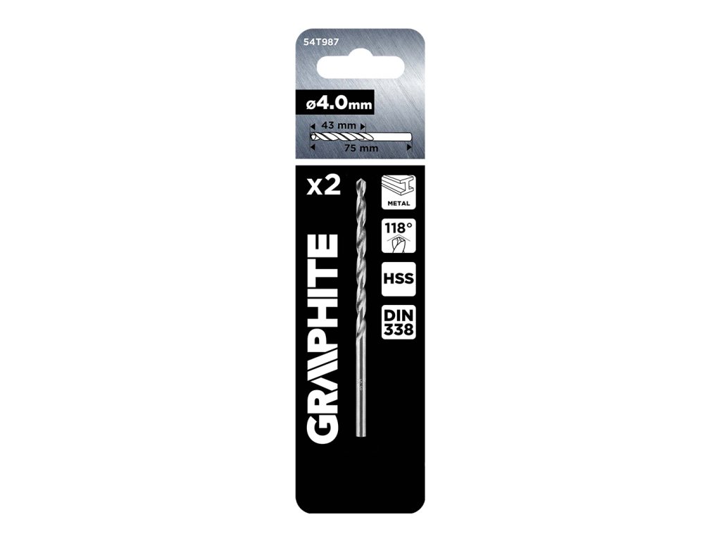 Vrtáky do kovu HSS, 4,0 mm, 2 ks. 54T987 od GRAPHITE je sada 2 vrtákov určených na prácu s kovom. Jednotlivé kusy majú priemer 4 mm, celkovú dĺžku 75 mm a pracovnú dĺžku 43 mm. Uhol hrotu vrtáka GRAPHITE je 118 stupňov. Nástroje sú v súlade s normou DIN 338 a budú užitočné pri amatérskych aplikáciách.