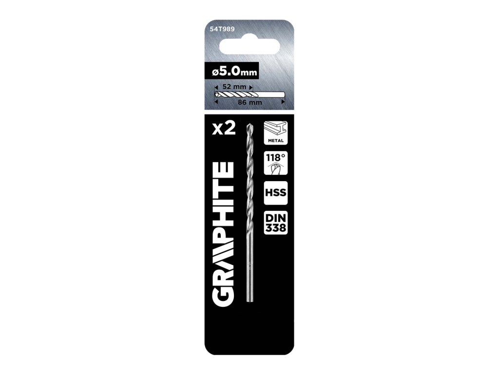 Vrták do kovu HSS, priemer 5,0 mm, 2 ks. Norma DIN 338, celková dĺžka 86 mm, pracovná dĺžka 52 mm. Uhol hrotu 118 stupňov.