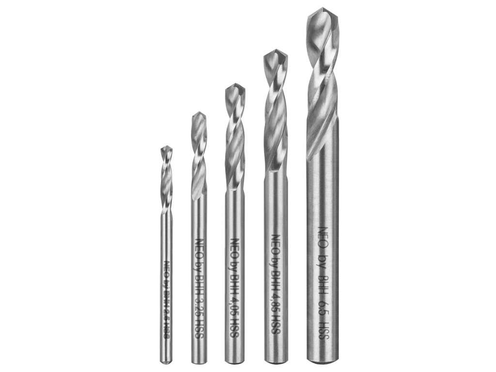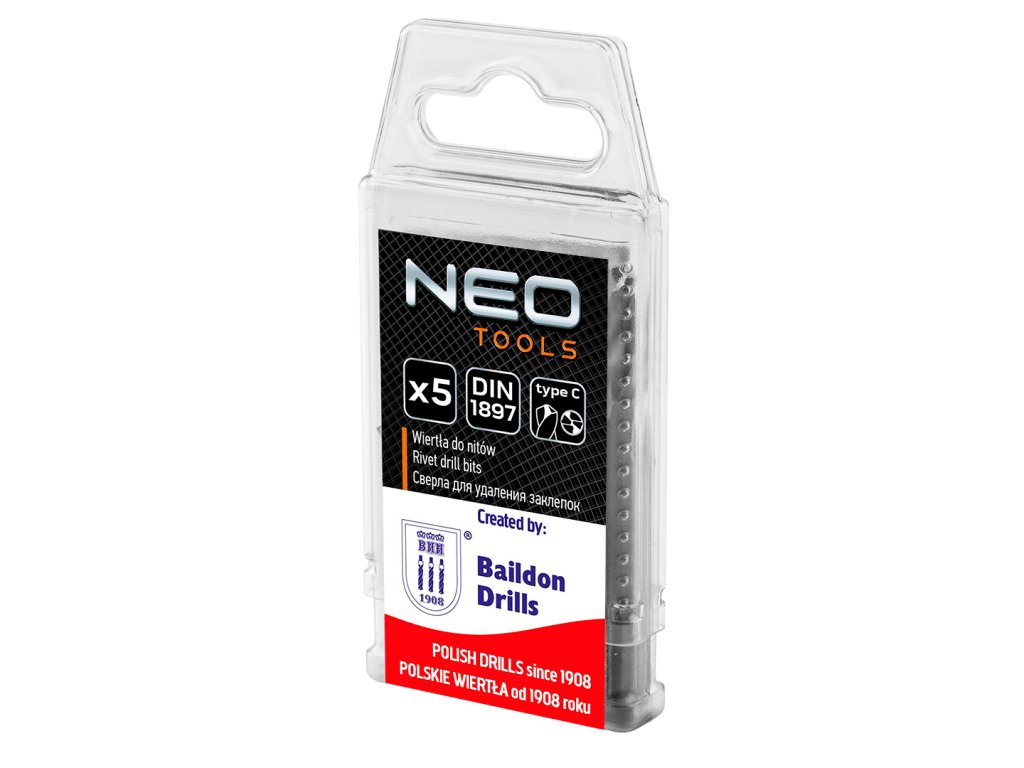 Sada špecializovaných vrtákov na vystružovanie samorezných nitov NEO (ref. 08-957) bola vytvorená v spolupráci s Baildon Drill Factory S.A. v Katoviciach. Vrtáky sú vyrobené z vysoko uhlíkovej HSS. Určené na vystružovanie nitov, vŕtanie do plechov, hliníka, medi a plastov. Sada obsahuje vrtáky s priemermi: 2,5, 3,25, 4,05, 4,85, 6,50 mm, s ostrením 118 stupňov a korekciou čepele typu "C", ktorej výhodou je správne centrovanie, menšia prítlačná sila a oddeľovanie triesok, čo vedie k lepšiemu odstraňovaniu. Majú valcové skľučovadlo. Produkt, ktorý je ideálny pre garáže, karosárne a ďalšie. Opakovane testované v garáži NEO, aby splnili očakávania profesionálov a automobilových nadšencov.