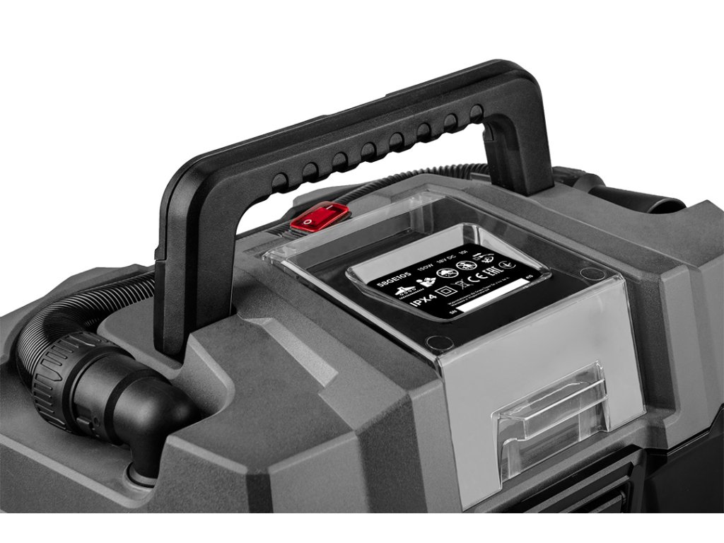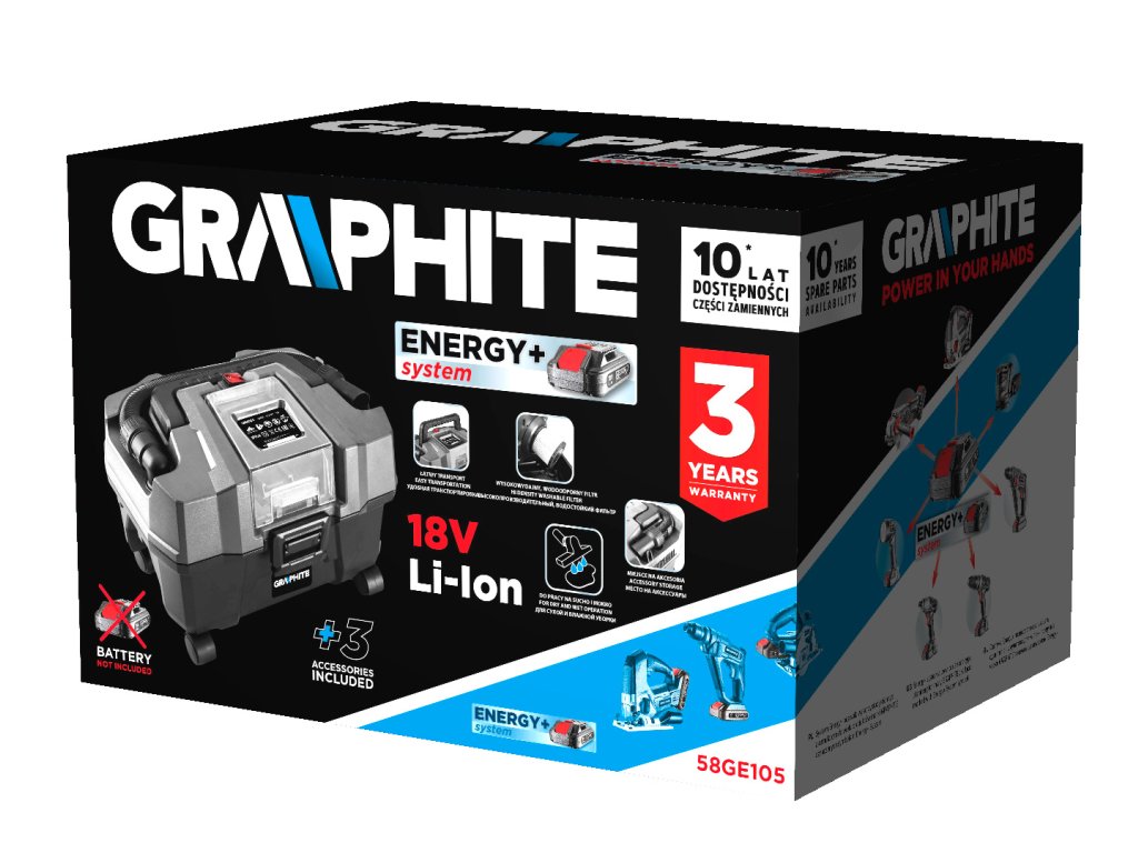 Energy+ 18V, Li-Ion, 10 L GRAPHITE Dielenský vysávač (ref. 58GE105) s objemom 10 l je stroj, ktorý funguje na batérie Graphite Energy+ 2 Ah alebo 4 Ah. Užitočný je pri čistení dielne alebo auta. Je určený na mokré a suché práce a má funkciu dúchadla. Je vybavený vodotesným hubicovým filtrom a filtrom HEPA. Prepravu uľahčuje široká výsuvná rukoväť a štyri prepravné kolieska. Súprava obsahuje 2 m ohybnú hadicu, HEPA a hubicový filter, dva pracovné nadstavce a ohybný adaptér.