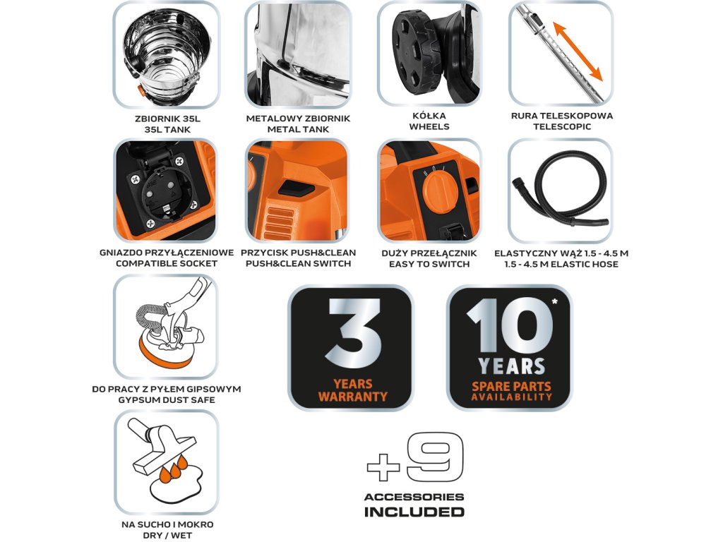 Priemyselný vysávač 1600W 04-739, menovitý výkon motora 1600 W, maximálny pomocný výkon 1800 W, celkový objem nádoby 35 l, dĺžka sacej hadice 1,5-4,5 m, priemer sacej hadice 35 mm, dĺžka napájacieho kábla 4 m, hmotnosť 7,5 kg
