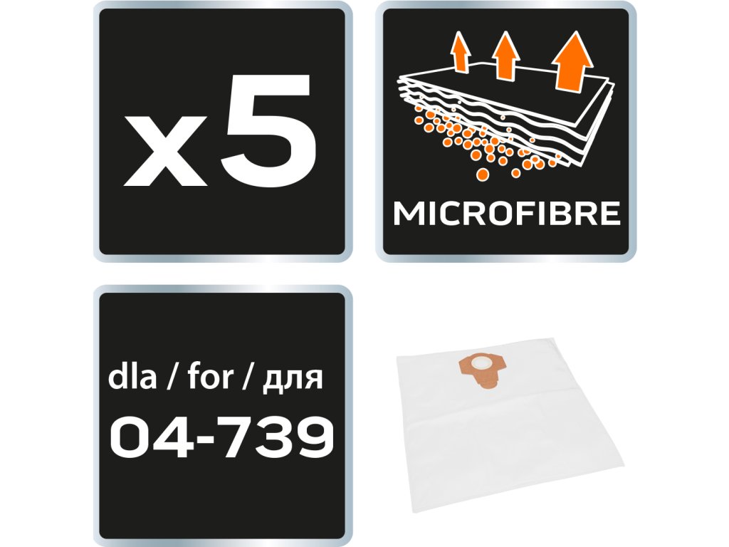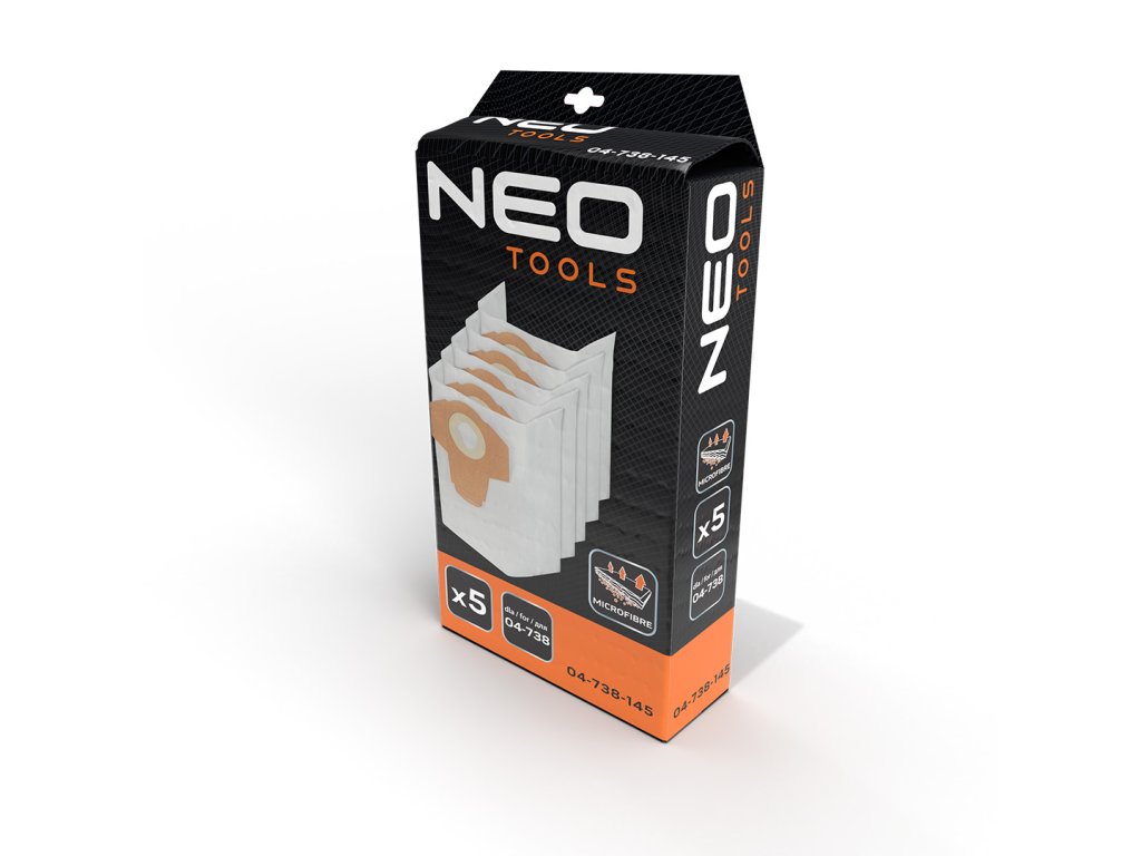 Vrecká do vysávača 04-738, 5 kusov 04-738-145 od spoločnosti NEO TOOLS sú praktické vrecká z mikrovlákna v súprave 5 kusov určené pre dielenský vysávač 04-738 s motorom s príkonom 1400 W na rýchle a účinné odstránenie nečistôt po práci v dielni. Vrecká sa vyznačujú odolnosťou a jednoduchou montážou. Sú ideálne pre mnohé situácie, v ktorých sa vyžaduje vysoká odolnosť výrobku.