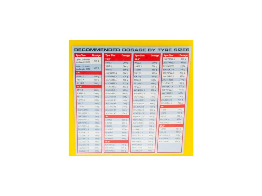 - Potrebné množstvo vyvažovacieho prášku sa líši v závislosti od veľkosti kolesa a pneumatiky.
