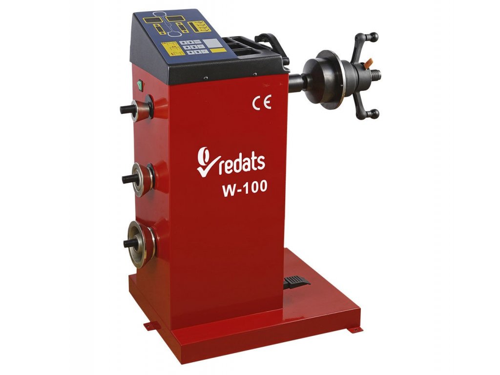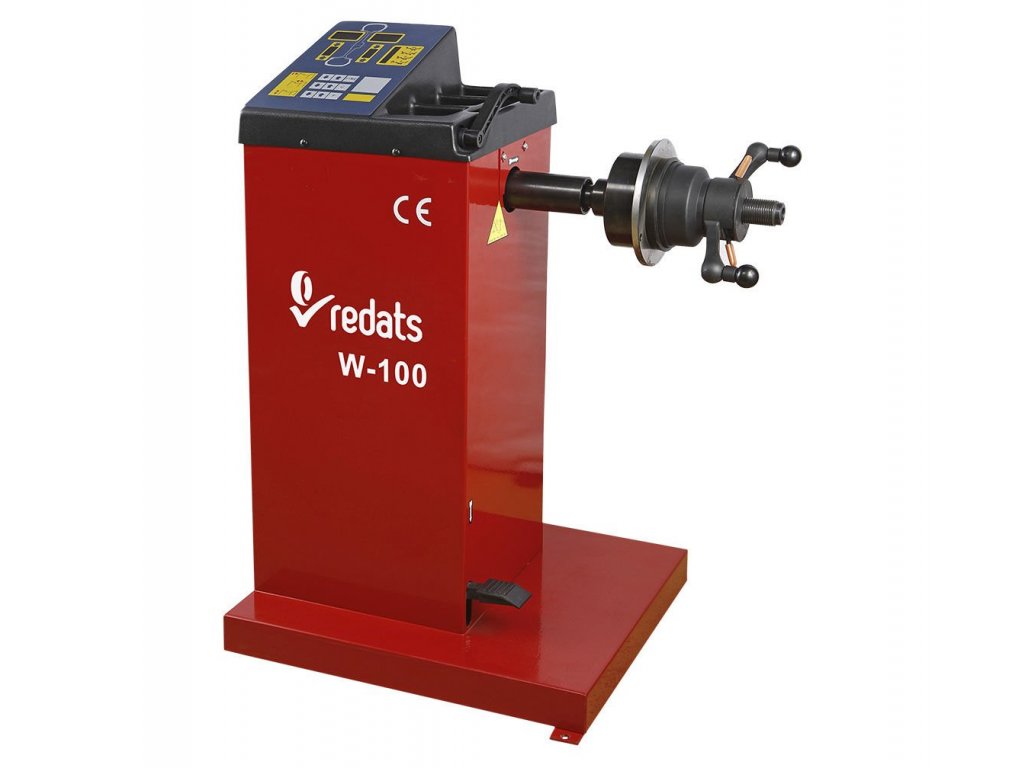 Profesionálna vyvažovačka kolies REDATS W-100 je poháňaná mechanicky - ručný pohon. Vyvažovačka je vybavená LED displejom a mimoriadne presnými piezoelektrickými snímačmi s presnosťou 1 g. Výhodou stroja je zabudovaná nožná brzda, ktorá umožňuje aretáciu vretena v mieste nevyváženosti, čo uľahčuje presné zaťaženie závažia.