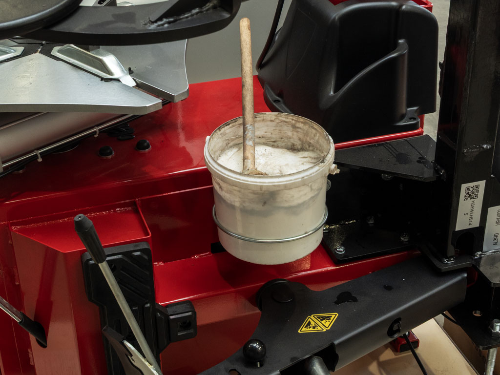 Prezúvačka je vybavená praktickým vstavaným držiakom na vedierko s montážnou pastou, čo uľahčuje prácu a zvyšuje komfort pri výmene pneumatík. Vďaka integrovanému držiaku máte pastu vždy po ruke.