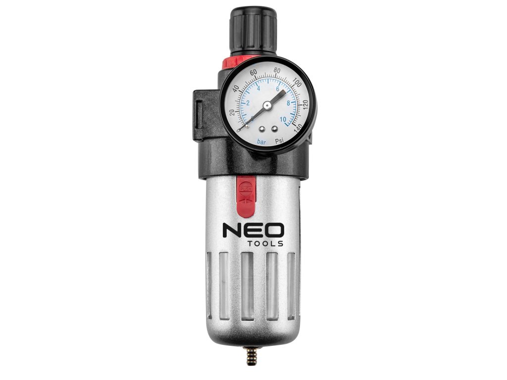 Filter dehydrátora NEO má robustné kovové telo s 1/2" prípojkou. Vybavený reduktorom tlaku. Stupeň filtrácie do 20 µm. Pracovný tlak do 12 barov. Funkcia poloautomatického vyprázdňovania nádrže. Maximálny prietok 2600 l/min, objem nádrže na koncentrát 60 cm3. Filter pomáha chrániť vzduchové náradie pred znečistením. Predlžuje životnosť pneumatického náradia tým, že ho chráni pred poškodením vodou zo stlačeného vzduchu. Certifikát CE potvrdzuje vysokú kvalitu výrobku. Značka NEO spĺňa očakávania profesionálov.