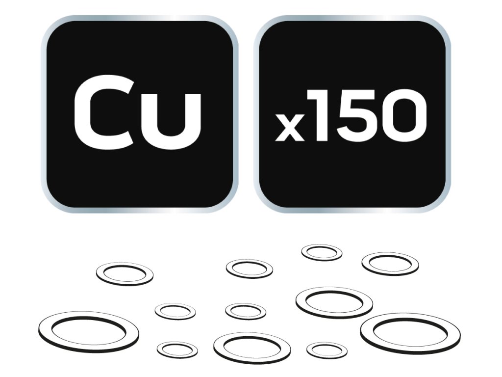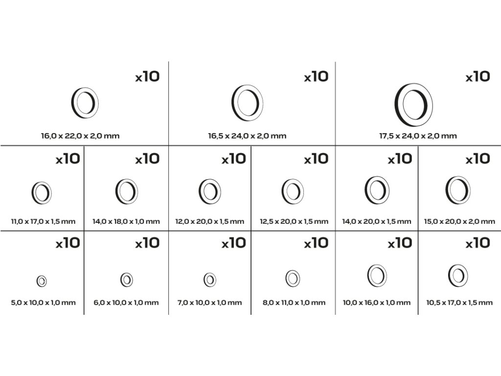 Medené podložky: 10 x (5x10x1 mm), 10 x (6x10x1 mm), 10 x (7x10x1 mm), 10 x (8x11x1 mm), 10 x (10x16x1 mm), 10 x (10,5x17x1,5 mm), 10 x (11x17x1,5 mm), 10 x (14x18x1 mm), 10 x (12x20x1,5 mm), 10 x (12x20x1,5 mm), 10 x (12,5x20x1,5 mm), 10 x (14x20x1,5 mm), 10 x (14x20x1 mm), 10 x (12x20x1,5 mm).5 mm), 10 x (15x20x2 mm), 10 x (16x20x2 mm), 10 x (16,5x24x2 mm), 10 x (17,5x24x2 mm)