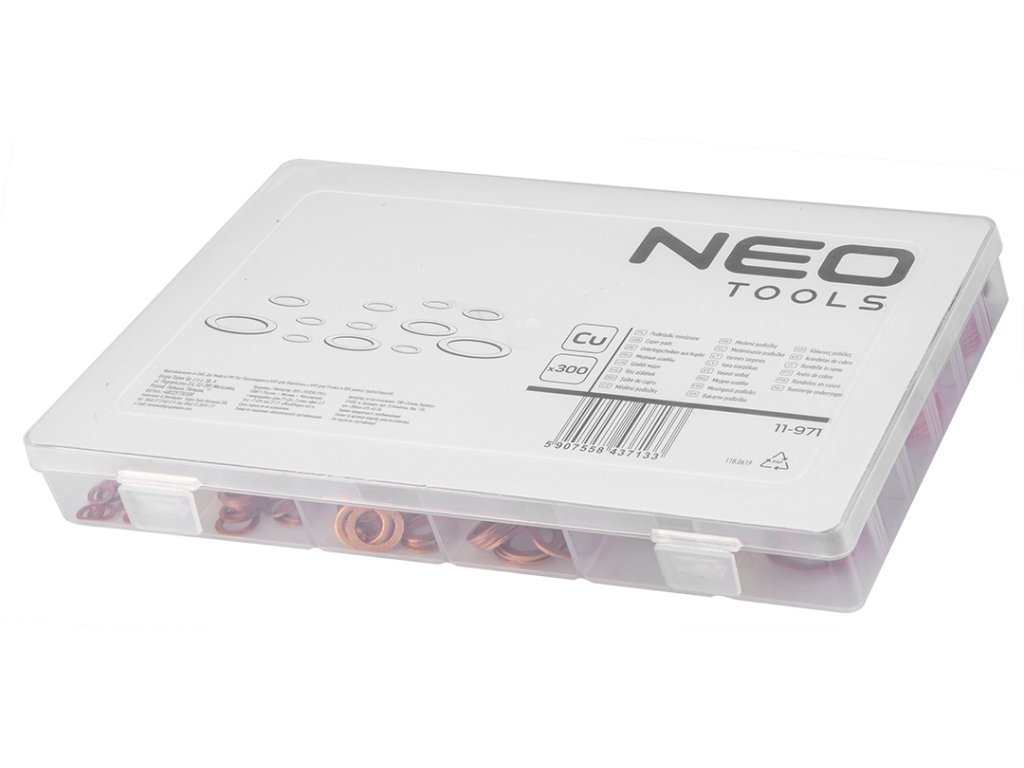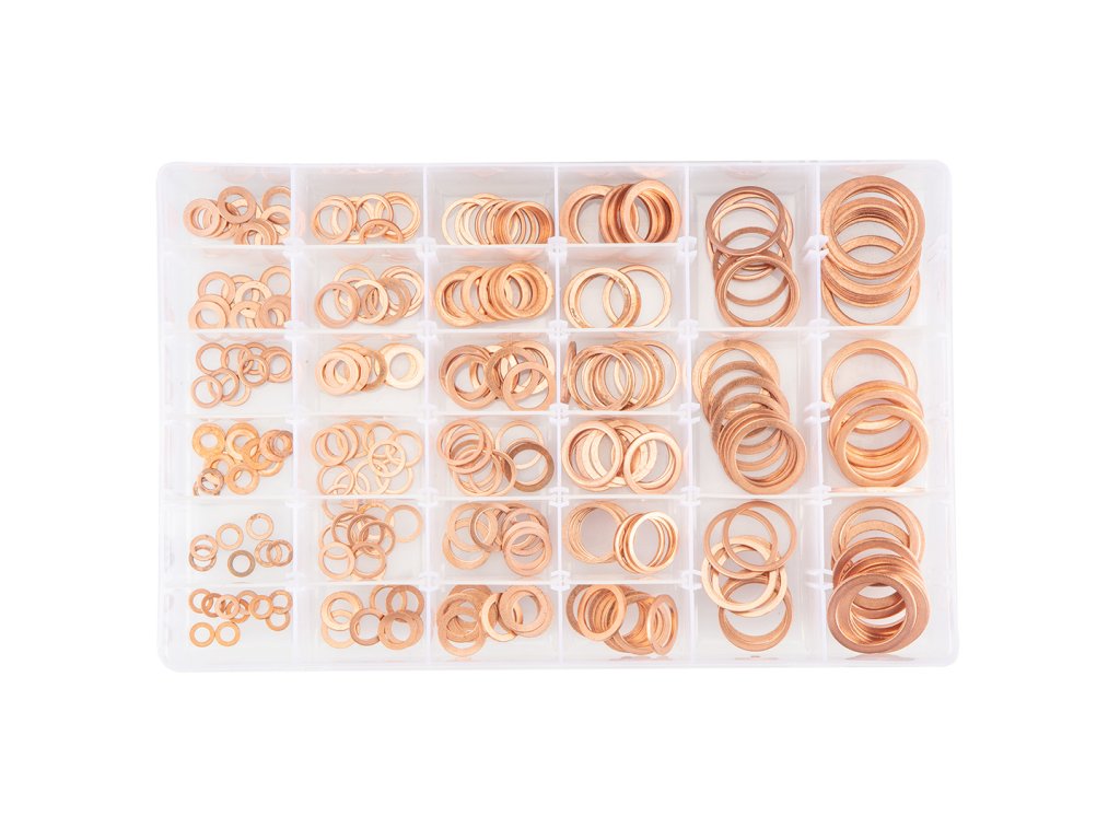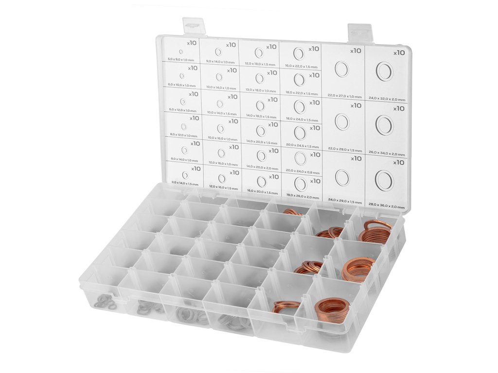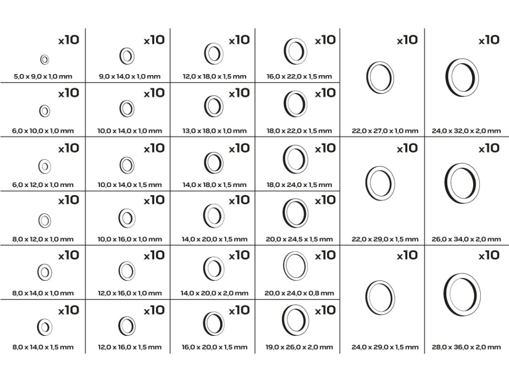 Medené podložky: 10 x (5x9x1,0 mm), 10 x (6x10x1,0 mm), 10 x (6x12x1,0 mm), 10 x (8x12x1,0 mm), 10 x (8x14x1,0 mm), 10 x (8x14x1,5 mm), 10 x (9x14x1,0 mm), 10 x (10x14x1.0mm), 10 x (10x14x1,5mm), 10 x (10x16x1,0mm), 10 x (12x16x1,0mm), 10 x (12x16x1,5mm), 10 x (12x18x1,5mm), 10 x (13x18x1,0mm), 10 x (14x18x1,5mm), 10 x (14x20x1.5mm), 10 x (14x20x2,0mm), 10 x (16x20x1,5mm), 10 x (16x22x1,5mm), 10 x (18x22x1,5mm), 10 x (18x24x1,5mm), 10 x (20x24,5x1,5mm), 10 x (20x24,5x0,8mm), 10 x (19x26x2.0 mm), 10 x (22x27x1,0 mm), 10 x (22x29x1,5 mm), 10 x (24x29x1,5 mm), 10 x (24x32x2,0 mm), 10 x (26x34,5x2,0 mm), 10 x (28x36,5x1,5 mm)