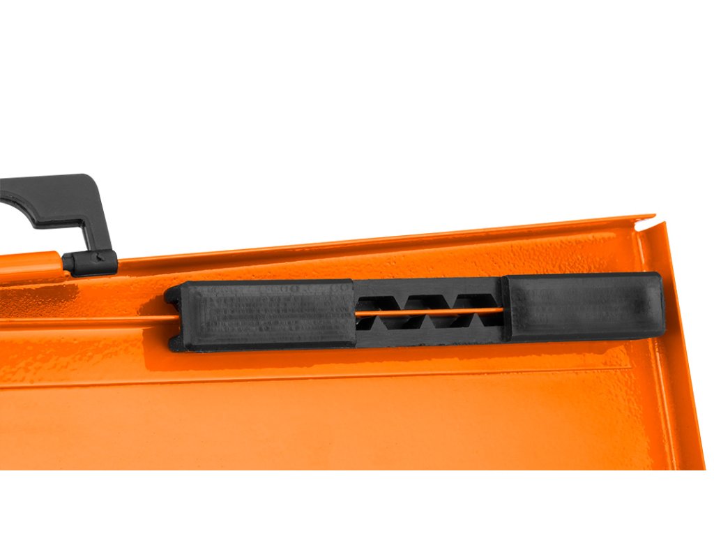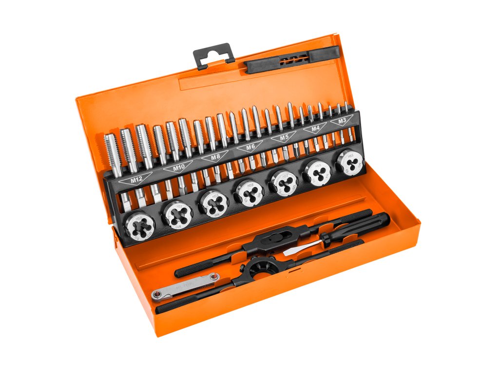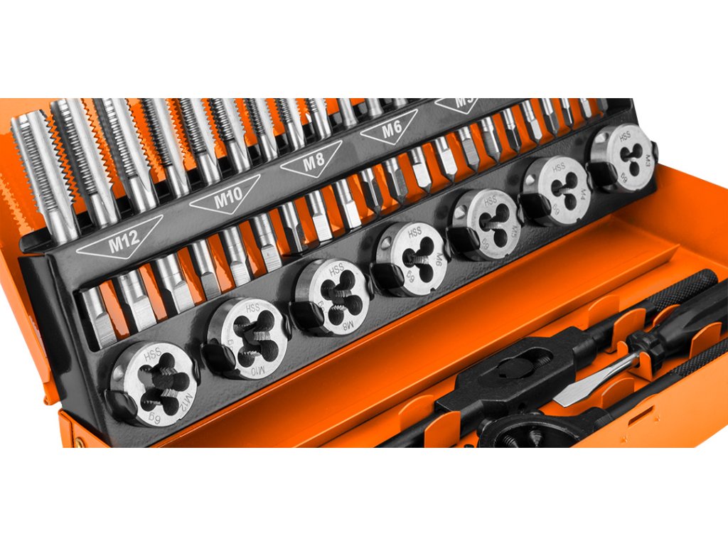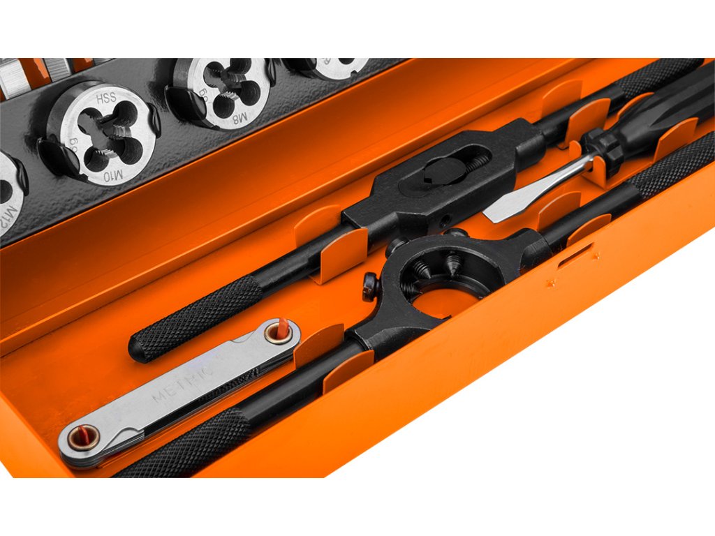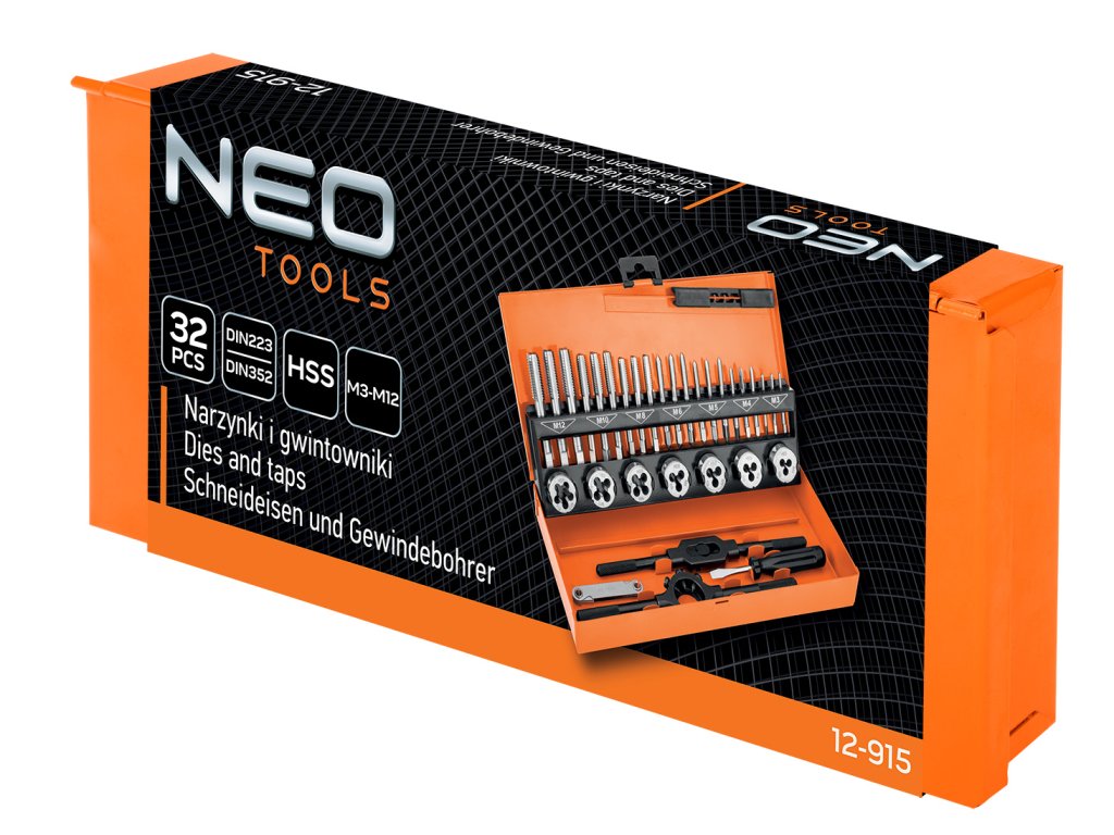 Závitníky a závitníky M3-M12, sada 32 ks. HSS v kufríku 12-915 od spoločnosti NEO je súprava nástrojov na rezanie závitov, ktorá obsahuje ručné závitníky a matrice, závitomer, skrutkovač na upevnenie matríc a praktický kovový kufrík na uloženie prvkov. Nástroje (matrice a závitníky) sú vyrobené z rýchloreznej ocele HSS, zatiaľ čo meradlo a skrutkovač sú vyrobené z ocele 45#. Sada ponúka závitníky vo veľkostiach: M3, M4, M5, M6, M8, M10, M12 a dláta vo veľkostiach - M3, M4, M5, M6, M8, M10, M12. Prvky značky NEO zabezpečujú väčšiu presnosť pri výrobe závitov. Určené na použitie v dielni a v strojárskych a zámočníckych profesiách.