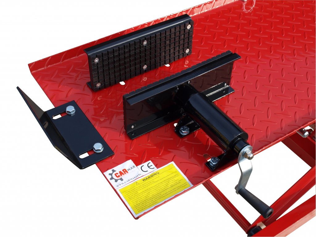 Praktická plošina na zdvíhanie motocyklov, vybavená bezpečnostnou mechanickou aretáciou v 3 polohách a možnosťou zmeny rozchodu kolies.