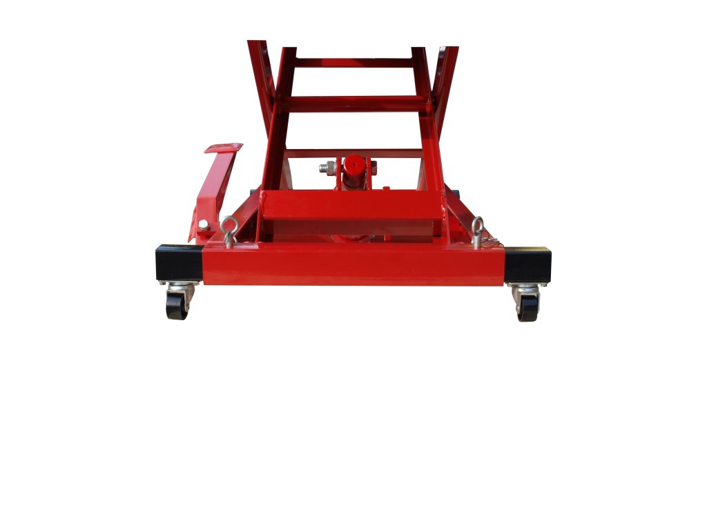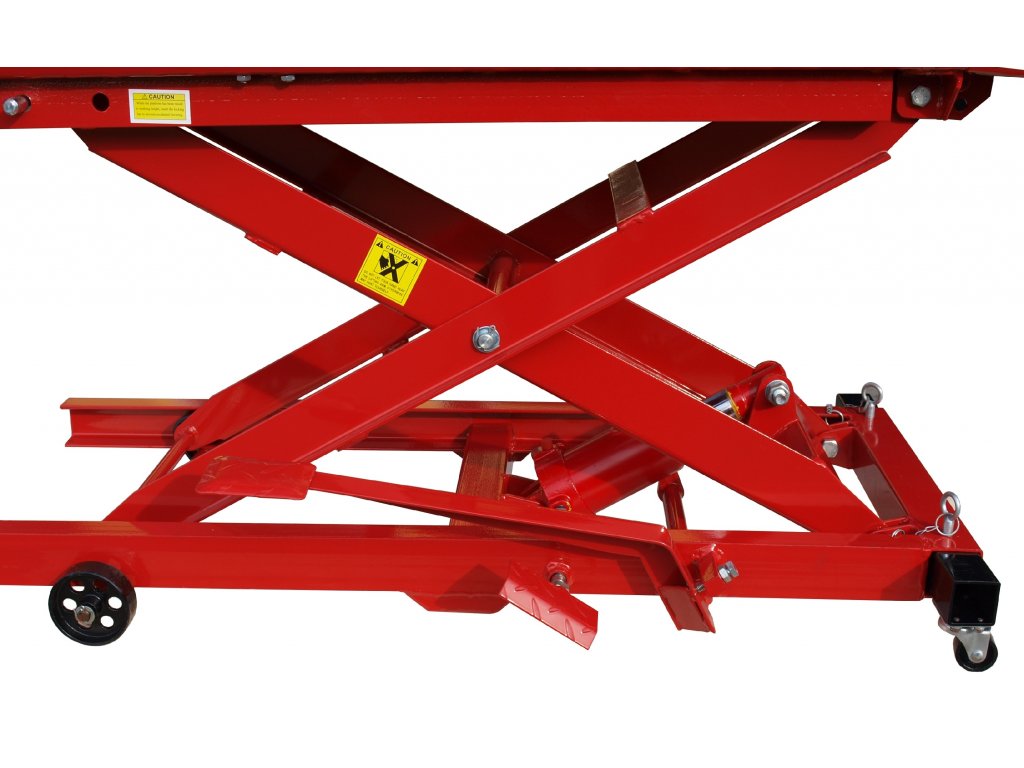 Zdvíhanie sa zabezpečuje obežným čerpadlom a kompresorom až do približne 8 barov (kompresor nie je súčasťou balenia). Ak kompresor nezapojíme, zdvih bude fungovať nožným čerpadlom. Spúšťanie sa vykonáva stlačením druhého pedálu (uvoľňovací ventil). Disponuje otočnými kolieskami na jednej a pevnými na druhej strane čo dopomáha k lepšej manipulácií. Taktiež disponuje bezpečnostným zariadením, ktoré zabraňuje pádu.