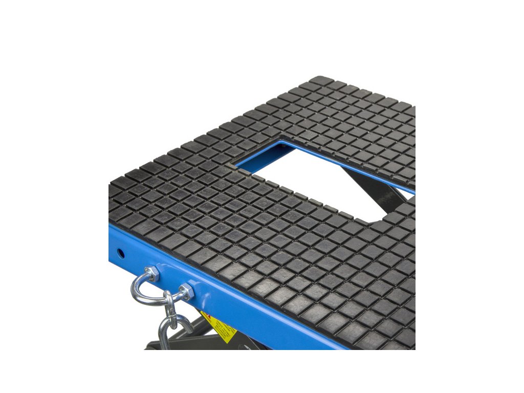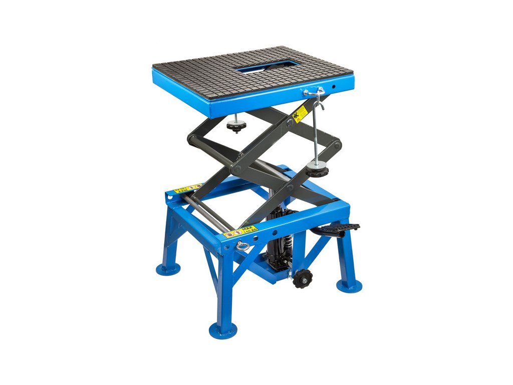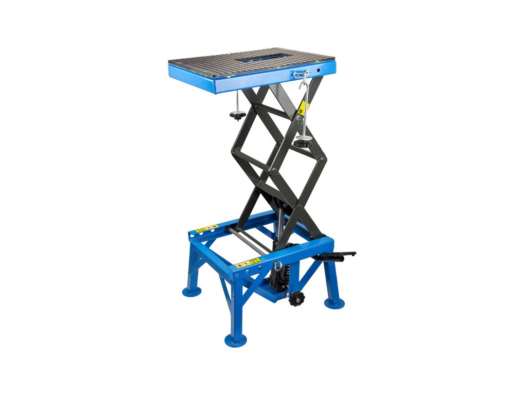 Nožnicový zdvihák určený pre motocykle a skútre do 135kg. Ideálny pre motocrossové a enduro motocykle s vyššou svetlou výškou. Dokonale poslúži v špecializovaných dielňach, doma v garáži alebo na pretekoch. Výrazne uľahčuje servisné práce na rôznych motocykloch vďaka trom stupňom pracovnej výšky: 64 cm, 76 cm a 87 cm. Pedál určený na zdvíhanie umožňuje uzamknutie v požadovanej výške. Plošina je potiahnutá gumou, ktorá zabezpečuje stabilitu pri zdvíhaní a práci na motocykle.
