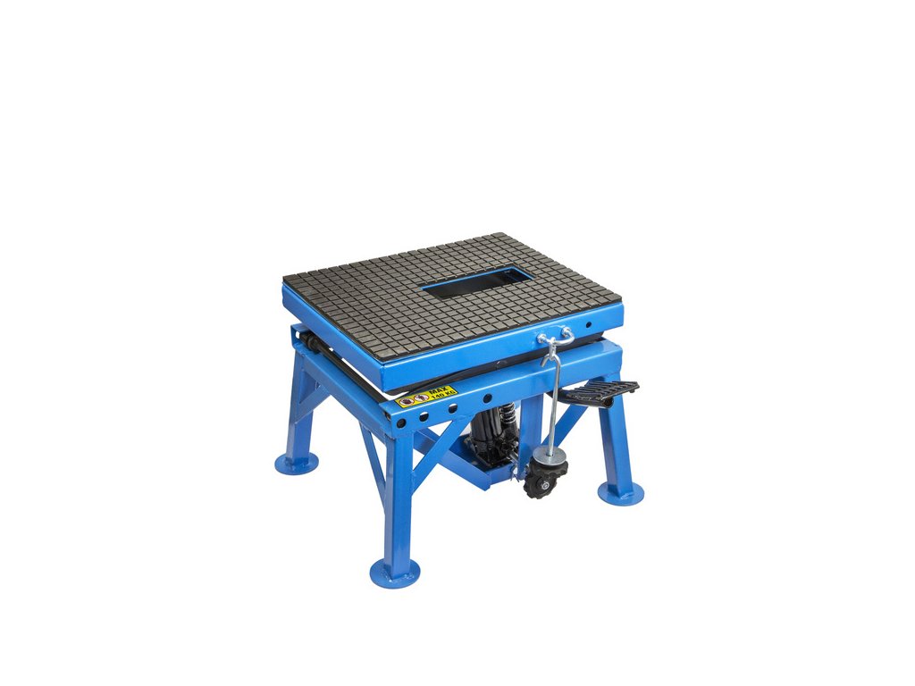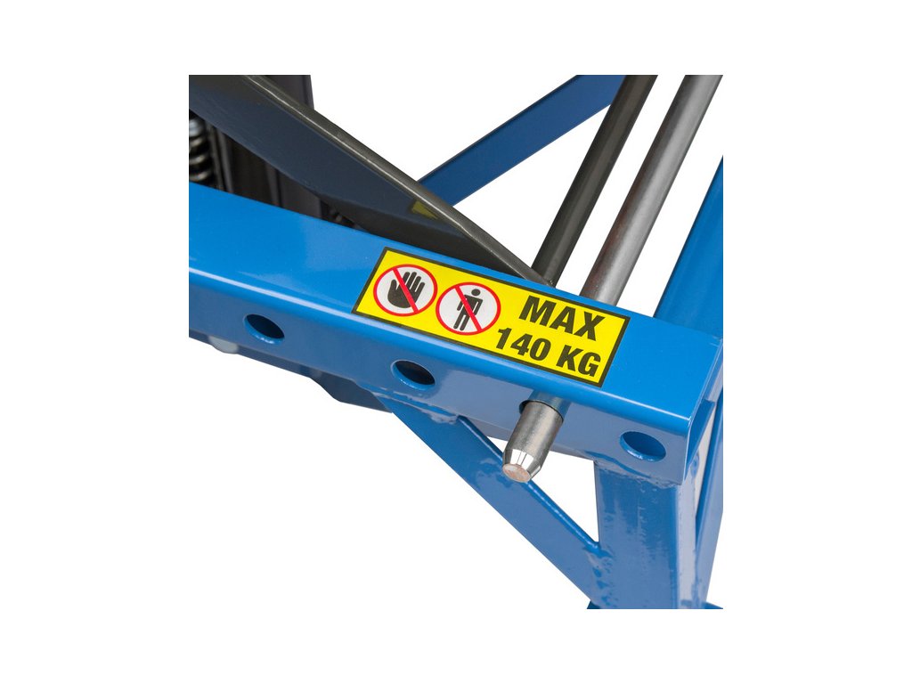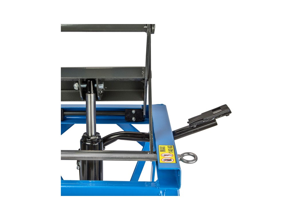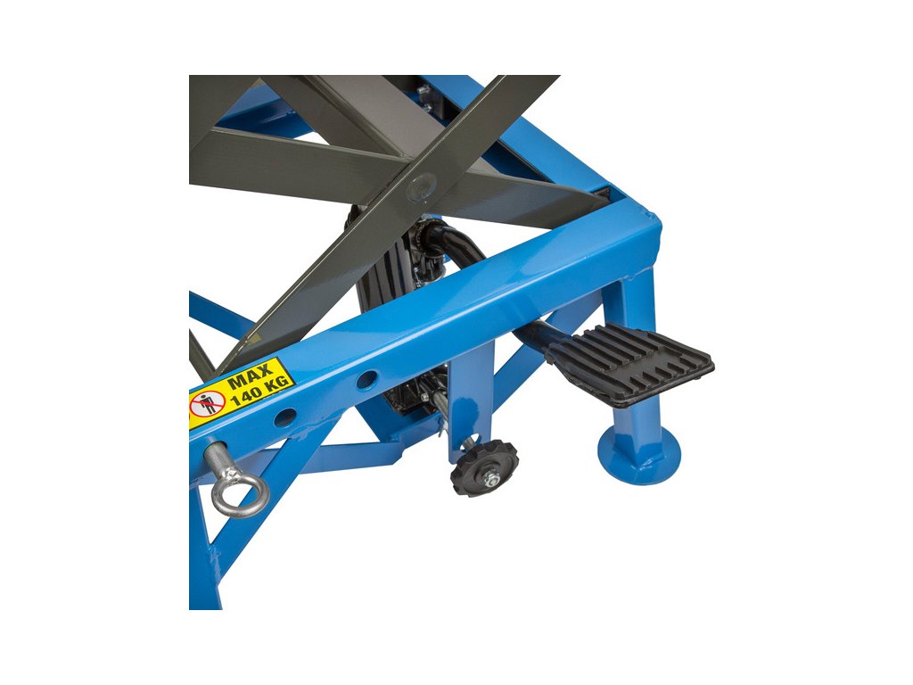Nožnicový zdvihák určený pre motocykle a skútre do 140kg s troma stupňami pracovnej výšky a maximálnym zdvihom 870 mm.