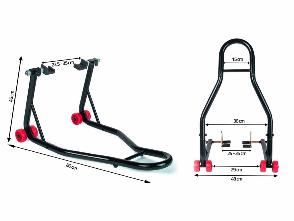 Stojan na motocykle je vyrobený z vysokokvalitnej ocele. Môžete naňho uložiť motorky do maximálnej hmotnosti 400 kg. Zostava ponúka v jednom balení predný aj zadný stojan, a tak bude vaša dielňa kompletne pripravená na servis motocyklov. Konštrukcia z veľmi kvalitnej ocele poskytuje výnimočnú stabilitu, čiže sa nemusíte báť pádu motorky zo stojana. O stabilitu sa starajú aj dve kolesá na oboch stojanoch, ktorými ich ľahko presuniete na miesto, na ktorom ich budete používať. Stojany sú navyše chránené proti korózii.