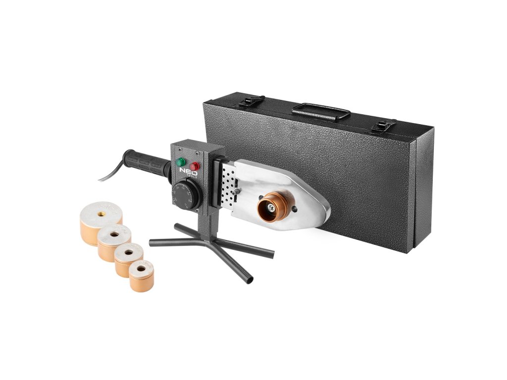 Zváračka NEO (ref. 02-400) na plastové rúry PE, PP, PB, s výkonom 800 W. Na zváranie objímok, rúr a tvaroviek s priemerom do 40 mm. Dodáva sa so 4 vykurovacími puzdrami s priemermi 20, 25, 32 a 40 mm. Puzdrá s PTFE povlakom na predĺženie životnosti. Teplota zváracej hlavy 0-300 °C zaručuje efektívnu prácu. Súprava je zabalená v praktickom kufríku. Kvalita nástroja potvrdená certifikátom CE. Značka NEO spĺňa očakávania profesionálov.