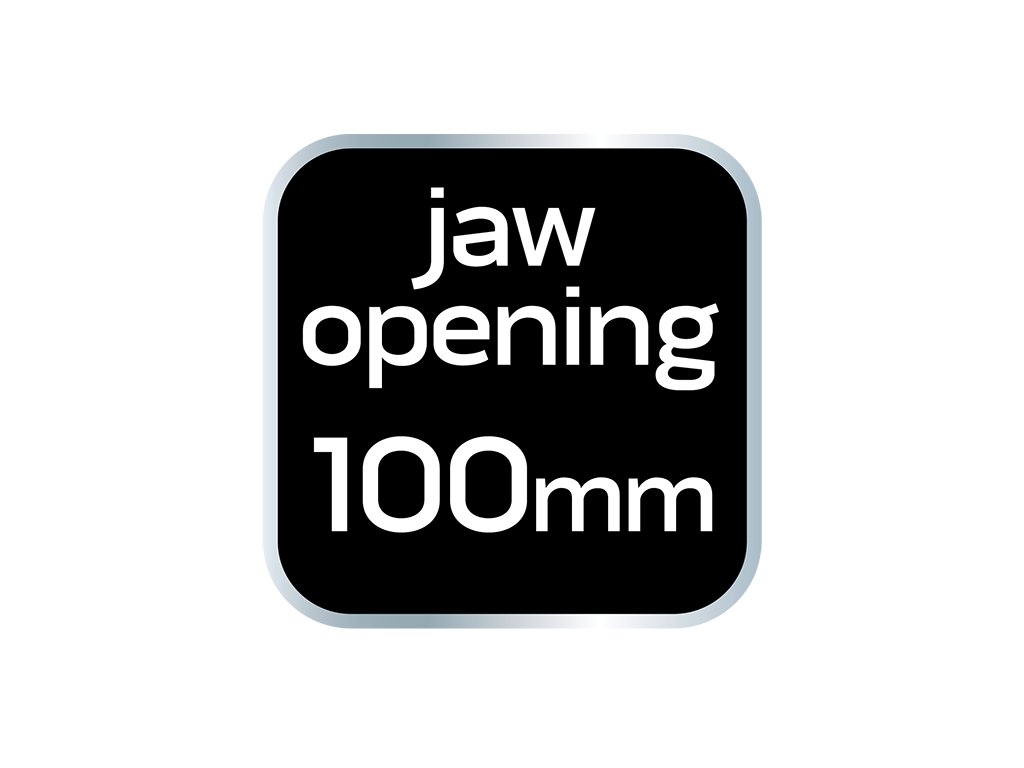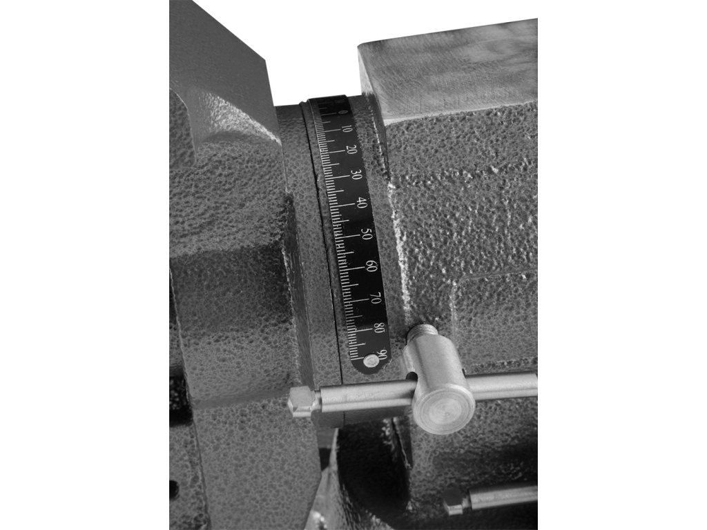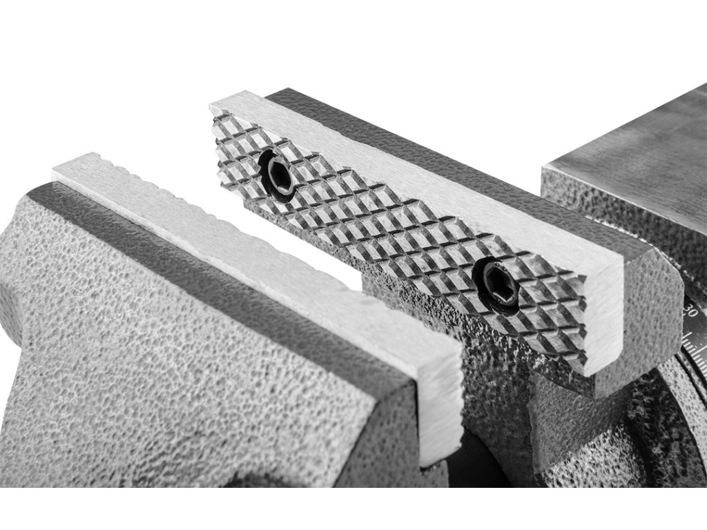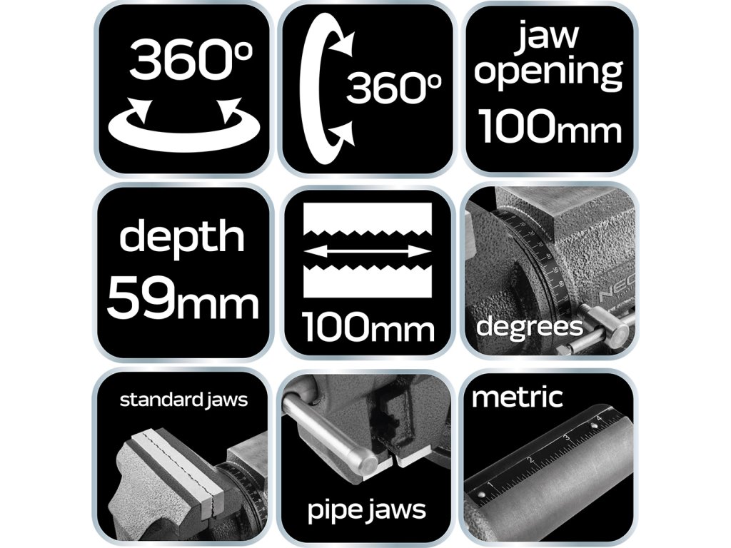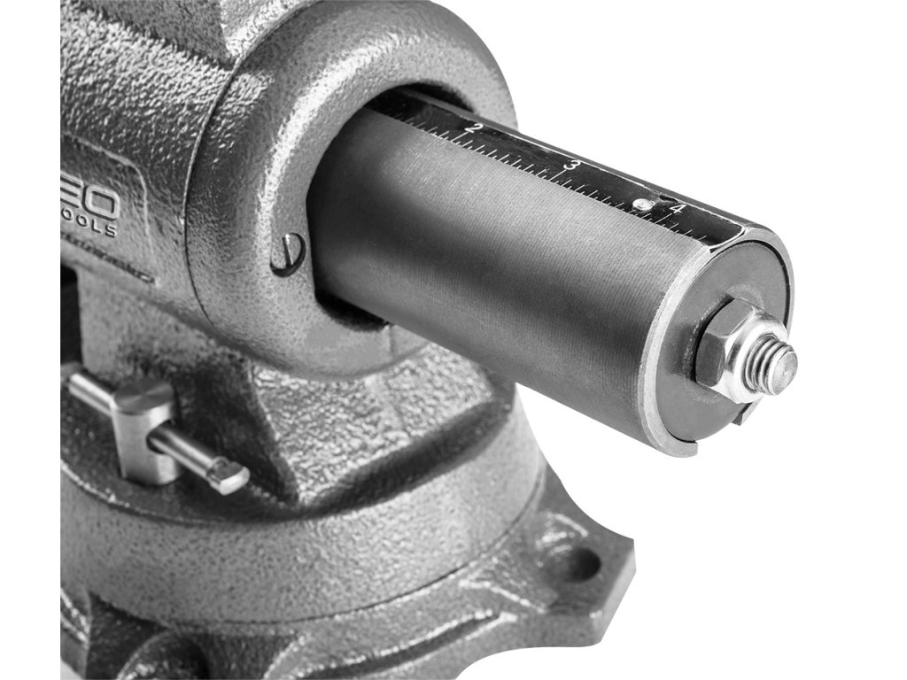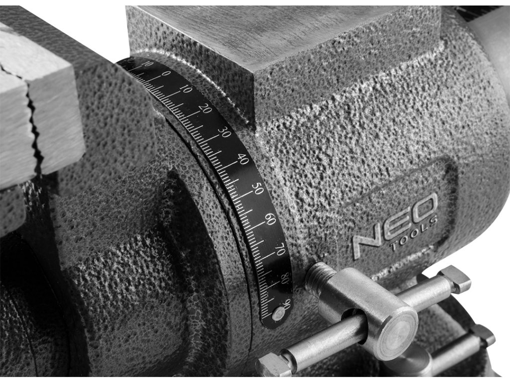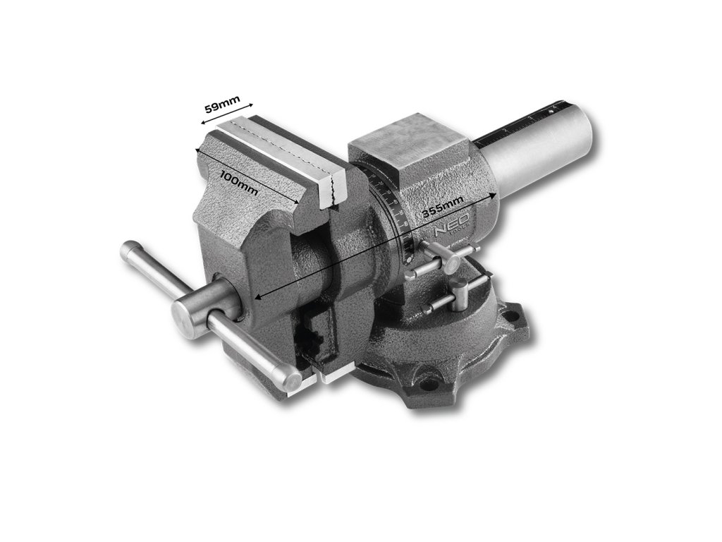 100 mm 360-stupňový otočný zámočnícky zverák 35-030 od spoločnosti NEO je ponúkaný s kovadlinou s rozmermi 60 x 48 mm a dvoma typmi čeľustí na oválne a bežné predmety - horná veľká čeľusť upína štvorcový predmet a spodná malá čeľusť upína okrúhly predmet. Hlava nástroja má možnosť plného otáčania. Základňa zveráka je vyrobená z odolnej tvárnej liatiny odolnej voči poškodeniu a telo je vyrobené zo sivej liatiny. Šírka čeľustí a ich otvor je 100 mm, hĺbka hrdla čeľustí je 59 mm a čistá hmotnosť celého nástroja je 10,3 kg. Rotačný zámočnícky zverák sa vyznačuje silnou upínacou a pridržiavacou kapacitou - až do 1 500 kg. Odporúča sa na všetky druhy dielenských a hydraulických prác.
